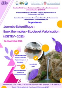 احتضنت رحاب الكلية متعددة التخصصات بتازة، التابعة لجامعة سيدي محمد بن عبد الله بفاس، يوم السبت 6 دجنبر 2025، أشغال اليوم العلمي حول المياه الحرارية – دراسات وتثمين (Journée Scientifique: Eaux Thermales – Études et Valorisation – JSETEV 2025)، في تظاهرة علمية نظّمها فريق البحث في المواد والموارد الطبيعية والبيئة والنمذجة ومختبر المواد والطرائق والتحفيز والأغذية الزراعية والبيئة، بشراكة مع الجمعية المغربية للموارد الطبيعية والبيئة والتنمية المستدامة.