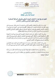 قررت وزارة التربية الوطنية والتعليم الأولي والرياضة تأجيل إجراء الامتحانات الموحدة المحلية بسلكي التعليم الابتدائي والثانوي الإعدادي، حيث ستُجرى يومي 20 و21 يناير 2026 بدل 19 و20 يناير 2026، كما كان مبرمجاً سلفاً.