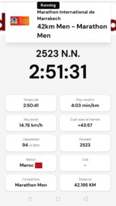 وبفضل هذا الإصرار، حقق العداء التازي نتيجة مشرفة، حيث أنهى السباق في زمن 2 ساعات و51 دقيقة، محتلًا الرتبة 94 ضمن فئة المحترفين، والمرتبة 56 ضمن فئة الماستر، من بين أكثر من 16 ألف عداء وعدّاءة يمثلون أزيد من 70 دولة من مختلف القارات، وهو إنجاز يُحسب له ويشرّف مدينته تازة.