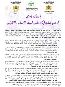وفي ختام الندوة، تم التأكيد على أن هذا المشروع يندرج ضمن دينامية مجتمعية تروم دعم تمكين المرأة وتعزيز حضورها في الحياة العامة، من خلال تطوير قدراتها وإتاحة فضاءات للتأطير والحوار، بما يساهم في توسيع آفاق مشاركتها في تدبير الشأن المحلي والمساهمة في تحقيق تنمية مجتمعية أكثر توازناً وشمولاً.