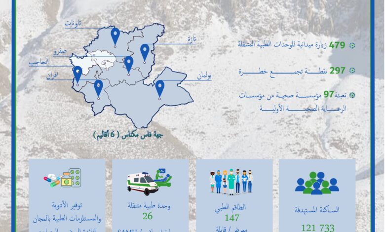 ولمواكبة هذه العملية على مستوى الأقاليم المعنية بجهة فاس مكناس، وضعت المديرية الجهوية للصحة مخططا جهويا شرع في تنزيله من 15نونبر 2025 الى غاية 30 مارس 2026 لتقديم وتقريب الخدمات الصحية الأساسية والأدوية اللازمة للساكنة المتضررة والتي تقدر بحوالي 121733 شخص من ساكنة المناطق الجبلية المعزولة و المعرضة أساسا لموجة البرد وذلك بتنسيق مع مندوبيات وزارة الصحة و الحماية الاجتماعية والسلطات المعنية بأقاليم صفرو، بولمان، إيفران، تاونات وتازة و الحاجب